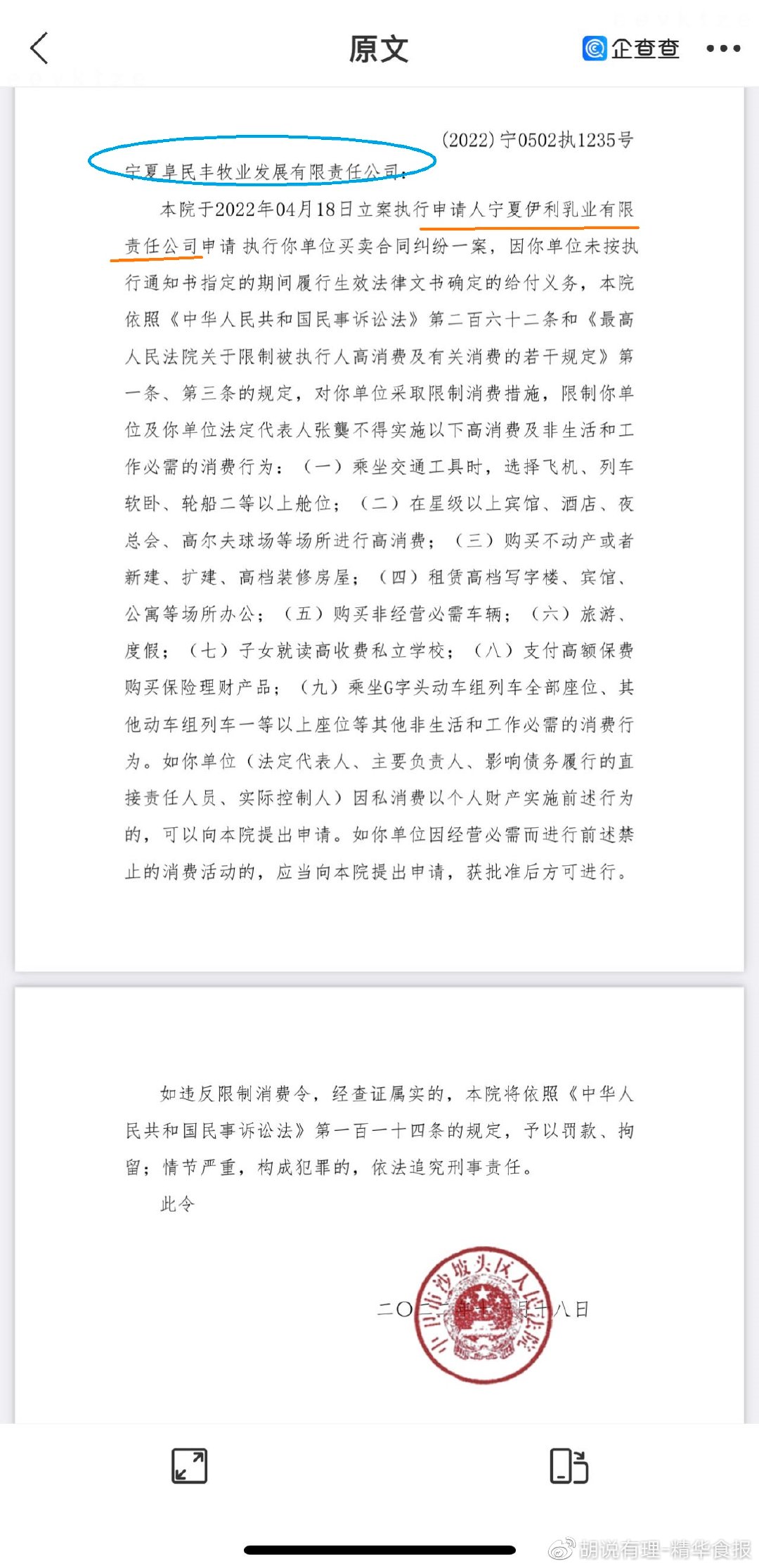 阜民丰牧业是现代牧业控股90%的子公司。企查查显示,该案件疑似申请人执行人是“宁夏伊利乳业有限责任公司”,后者为伊利全资子公司。