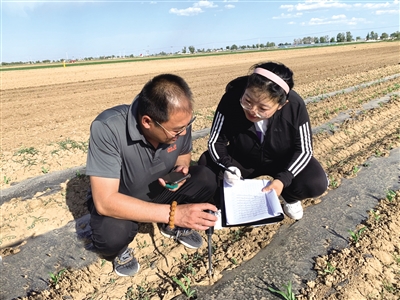 - 科技特派员测量土壤盐碱度和土壤EC值。
