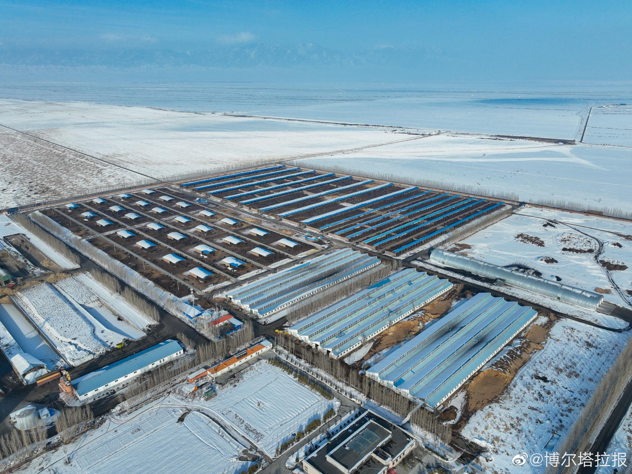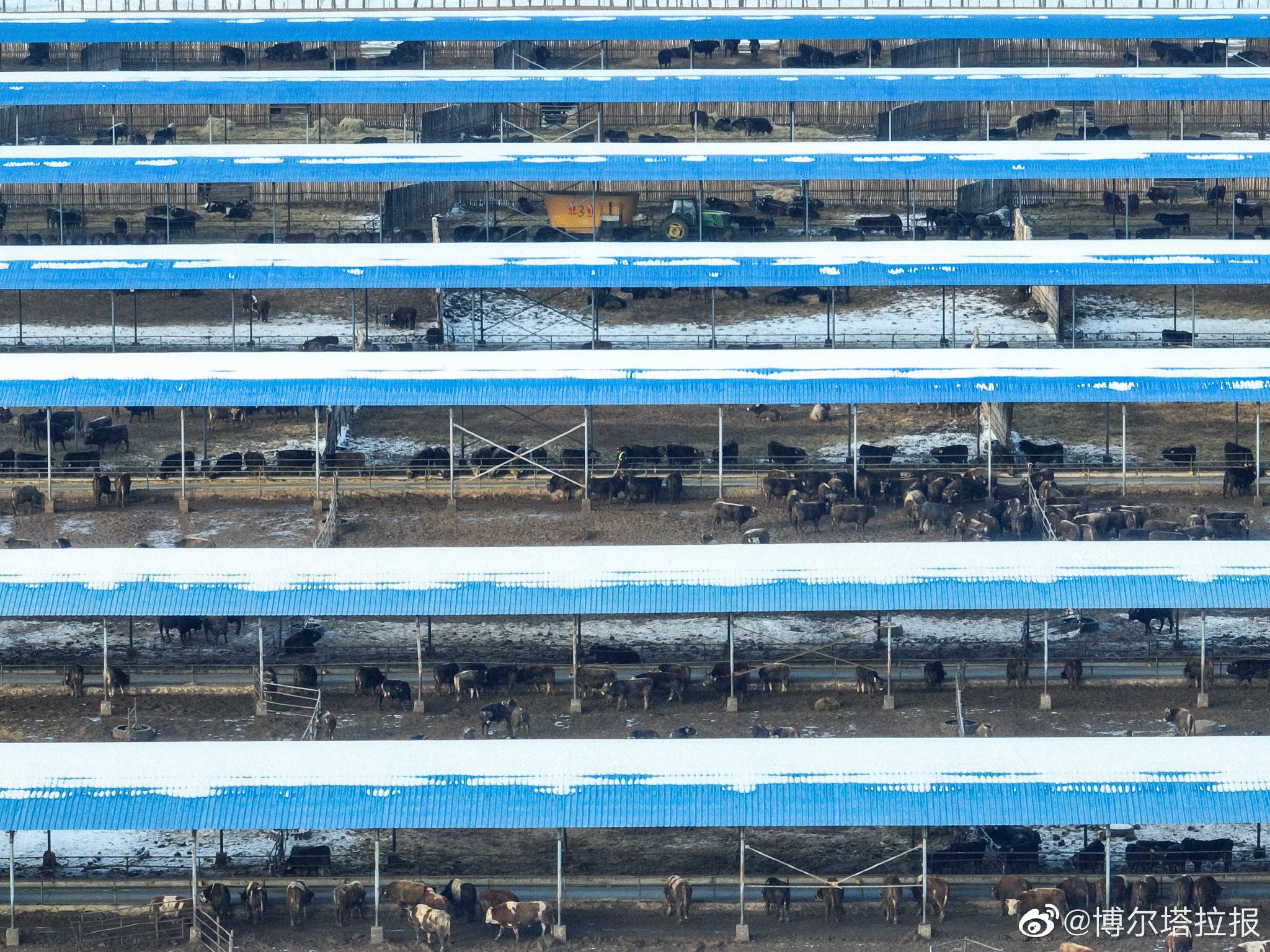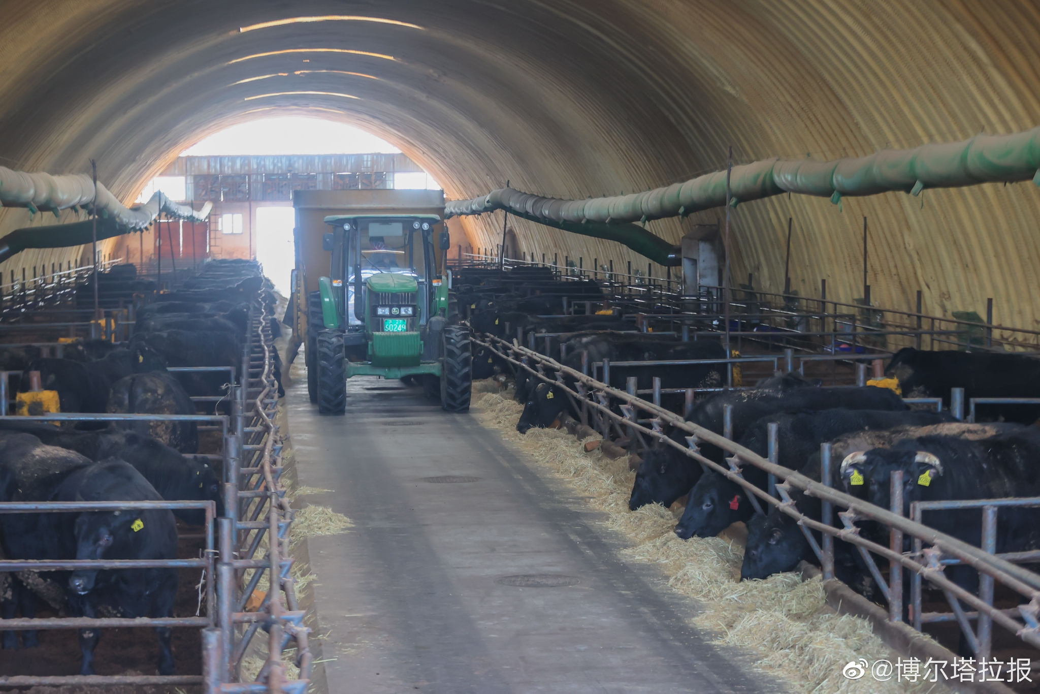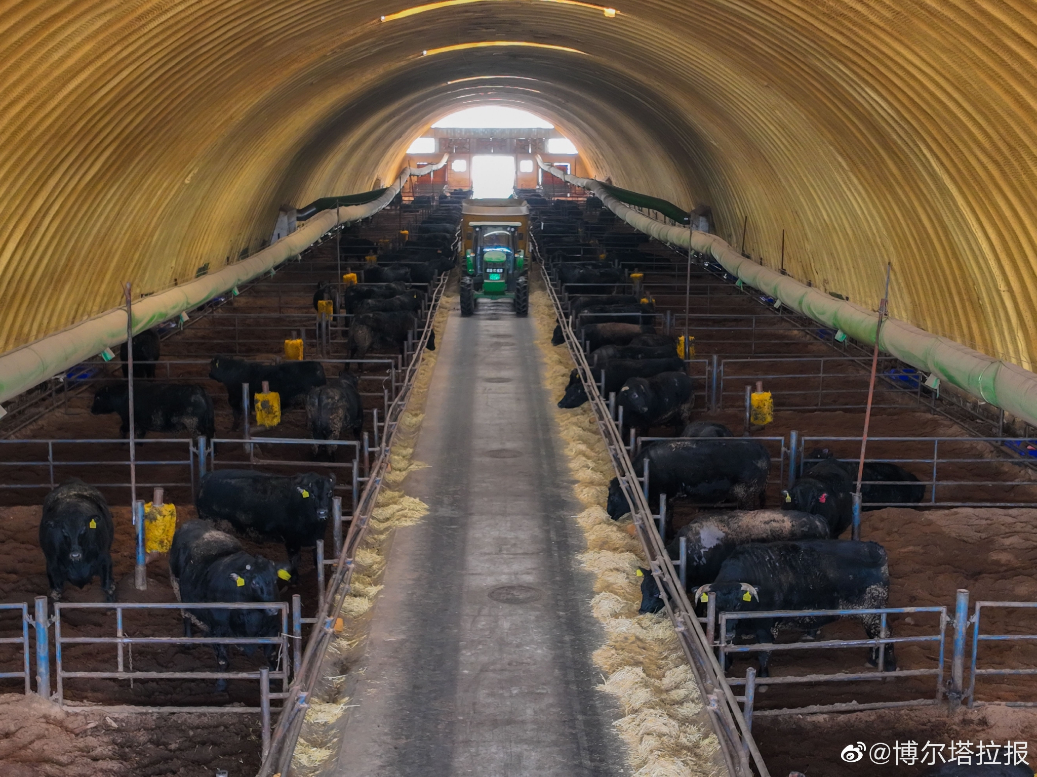 #博州新闻# 2月10日,在新疆天莱牧业集团有限责任公司养殖园区,车辆正在给牛投料。据悉,天莱牧业园区拥有8万亩有机草料种植基地,有存栏万头纯种安格斯繁育基地,有5万头规模的育肥基地,已实现年出栏繁育种牛5000头,生产冻精300万枚,出栏育肥牛4.5万头。