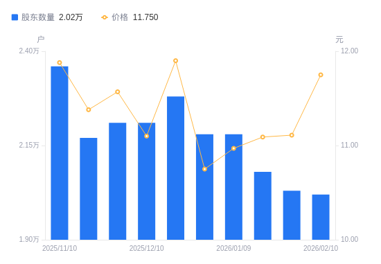 近一年(2025年2月10日至2026年2月10日),西部牧业A股股东户数从2.33万户,减低至2.02万户,降幅13.30%,区间股价上涨36.95%。